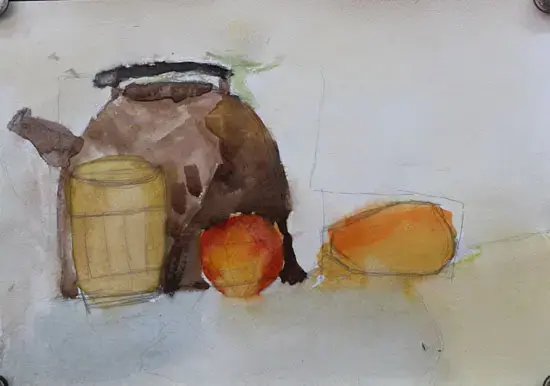 Выполняя натюрморт по сухому листу в технике алла прима, рисующий наносит на бумагу один слой акварельной краски нужного цветового тона, насыщенности и светлоты. Благодаря наклонной плоскости и тому, что каждый последующий мазок кладется рядом с еще непросохшим предыдущим, цвета частично соединяются между собой, образуя плавные переливы, создавая дополнительные оттенки. Для того чтобы создать мягкие переходы одного цвета в другой, лучше вводить темные оттенки в светлые, а не наоборот. Внести поправки в красочный слой можно, пока он не высох.