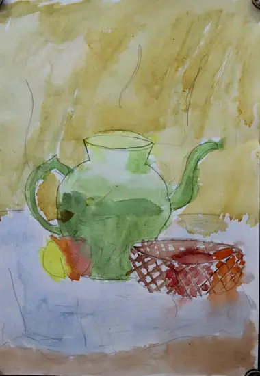 Учитель: сегодня, ребята, мы с вами будем рисовать натюрморт в технике алла-прима. А кто мне скажет, как переводится термин «алла-прима»? (однослойная живопись акварельными красками). Работа в этой технике может выполняться по сухому и сырому листу бумаги.