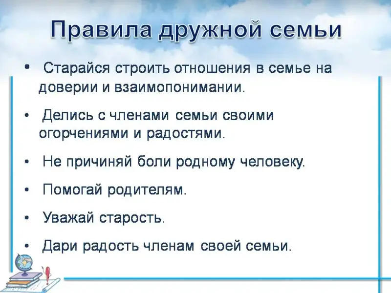 (Выслушиваются ответы детей) Предлагаю вам посмотреть: совпадают ли ваши предложенные правила с теми, которыми надо руководствоваться, чтобы упрочить семью: - Старайся строить отношения в семье на доверии и взаимопонимании. - Делись с членами семьи своими огорчениями и радостями. - Не причиняй боли родному человеку. - Помогай родителям. - Уважай старость. - Дари радость членам своей семьи. |