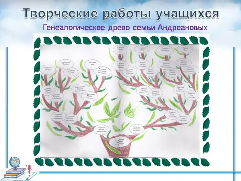 Человек растет и задумывается над вопросом: «Кто? Откуда? Каковы мои корни?». Издавна одной из традиций русского народа было знание своих предков, своей родословной. Сегодня старинная традиция возвращается. А наука, которая занимается родословной, называется генеалогия. Кто знает, что означает это слово? (с греческого - родословная, это наука о родственных связях; это систематическое собрание сведений о происхождении, преемстве и родстве фамилий и родов.) С давних времён принято изображать родственные связи в виде дерева, которое называется генеалогическим древом. Составляя генеалогическое древо, люди попытались увидеть корни своей семьи. Если человек помнит о своих корнях, то можно надеяться, что его семья будет прочной и счастливой, сохраняя семейные традиции и ценности. Мы на прошлом уроке говорили о генеалогии и ваше домашнее задание было составить генеалогическое древо вашей семьи. Вот некоторые работы. |