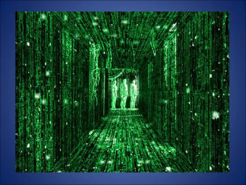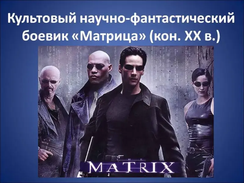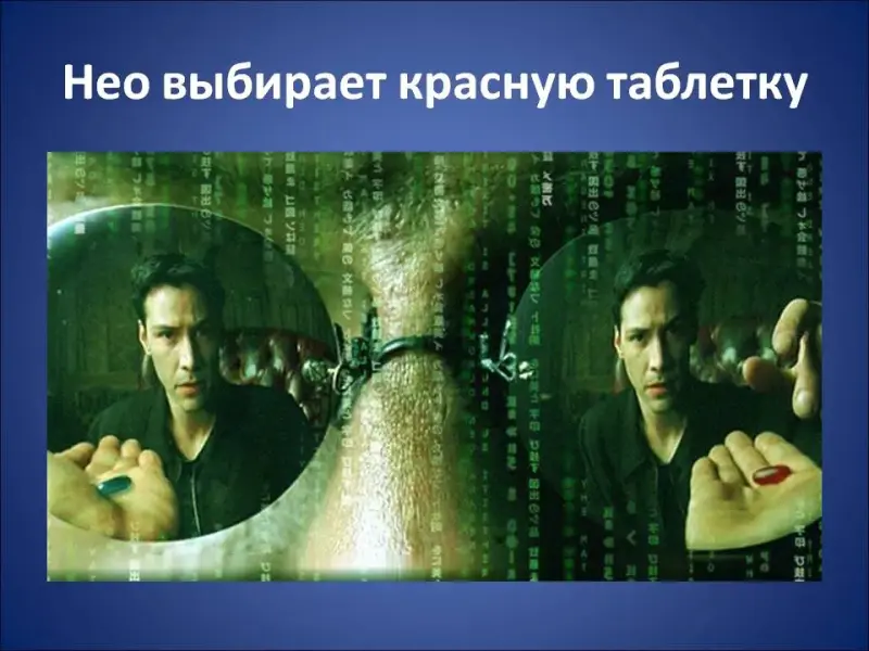 В конце ХХ века на экраны вышел всем известный культовый научно-фантастический боевик «Матрица», снятый братьями Вачовски, с участием Киану Ривза (Слайд 2). «Приняв красную таблетку (Слайд 3), главный герой Нео попадает в жуткий разрушенный мир, который оказывается настоящим реальным миром. Он узнаёт, что привычный ему мир является иллюзией, порождённой искусственным интеллектом суперкомпьютера (Слайд 4).