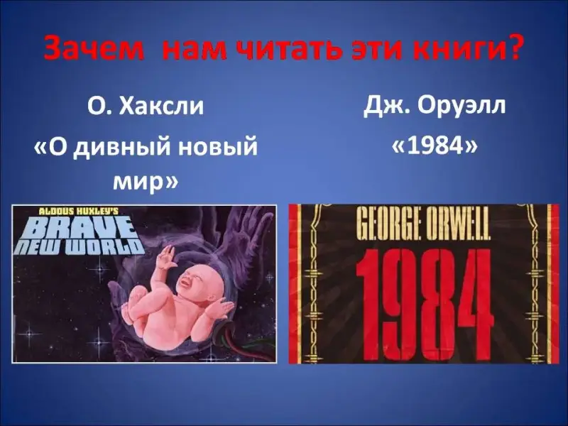 Цели урока: пробудить у школьников интерес к художественным текстам, ответить на вопросы: «Зачем читать романы Хаксли и Оруэлла? Чем эти авторы актуальны для нас сегодня?»
