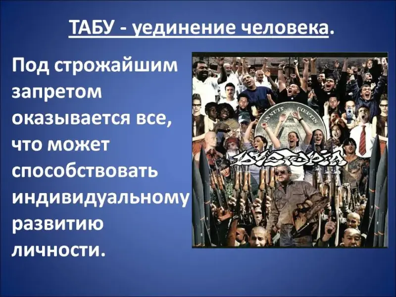 Главным запретом во всех фантастических обществах (Единое Государство, Океания, «дивный мир») было уединение человека и табу на любые глубокие чувства и переживания - то есть под строжайшим запретом оказывалось все, что каким-либо образом могло способствовать индивидуальному развитию личности (Слайд 8).