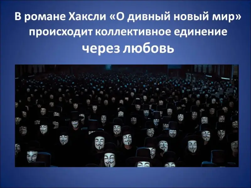 Если в романе Хаксли «О дивный новый мир» происходит коллективное единение через любовь (Слайд 10), то в романе Оруэлла «1984» единение людей идет через ненависть к одному злодею (Слайд 11). В этом, на первый взгляд, схожем процессе накапливания и сброса энергии заключена принципиальная разница между двумя анализируемыми романами.