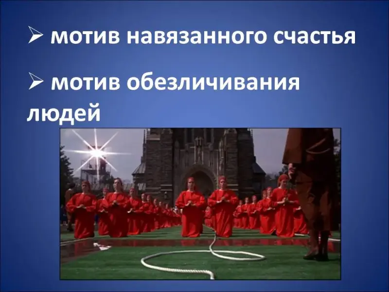 Если выделять смысловой стержень всех романов-антиутопий, то его можно обнаружить в нескольких основополагающих мотивах, во-первых, это мотив навязанного счастья. Есть некий «маленький человек», который ради спокойствия и комфортной «стерильно-чистой» жизни отдает свое право на личную свободу некому сильному «Благодетелю», который решает все за него, с одним только условием: человек должен полностью подчиниться воле Благодетеля, а во-вторых, это мотив полного обезличивания людей (Слайд 13).