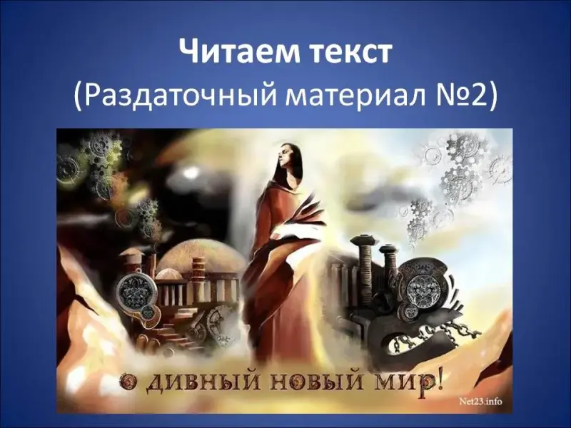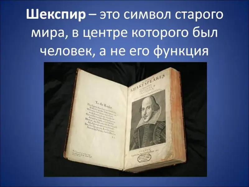 Есть. И этой объединяющей точкой между романами является Уильям Шекспир. Не случайно он возникает и у Хаксли, и у Оруэлла. Шекспир становится неким мерилом человечности. Для Уинстона из романа «1984» Шекспир - это часть забытого мира, где в центре всегда был человек, а не его функция в обществе (Слайд 15). Для дикаря Джона, воспитанного в резервации и живущего в дивном мире, Шекспир стал мерилом духовности, смысл которой не в получении удовольствия, а в творчестве и познании. Раздаточный материал №2. (Слайд 16). (Идет комментированное чтение отрывка).