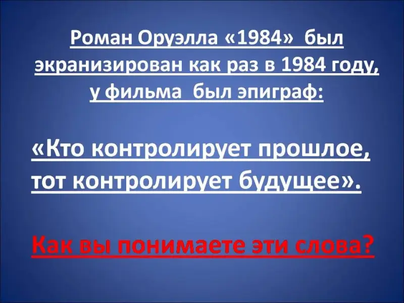 Слово учителя. Обратимся к тексту Оруэлла «1984». Интересно отметить, что роман был экранизирован как раз в 1984 году, у фильма был эпиграф: «Кто контролирует прошлое, тот контролирует будущее» (Слайд 17-18).
