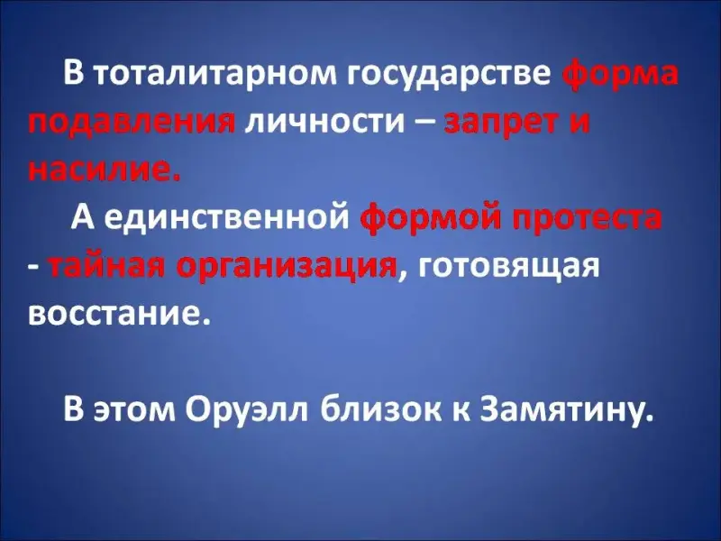 Оруэлл в романе «1984» выступает с явным протестом против жестокого тотального контроля и безоговорочного подчинения. В тоталитарном государстве единственной формой подавления личности и сознания был запрет и насилие. А единственной формой протеста была тайная организация, готовящая восстание. Только таким могло быть угнетение и только такой - борьба против него. В этом Оруэлл близок Замятину.