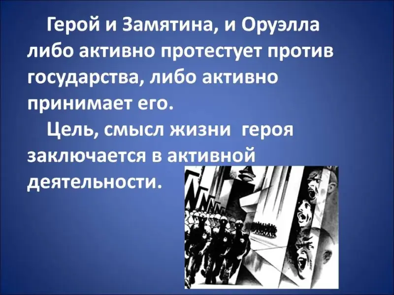 Герой и Замятина, и Оруэлла всегда активен: он либо яростно протестует против государства, либо полностью его принимает. Цель героя заключается в активной деятельности либо «за», либо «против». Человек в мире Замятина и Оруэлла живет «ДЛЯ, РАДИ, ВО ИМЯ чего бы то ни было - общества, идеи, борьбы и т.д»[7] (Слайд 20-21).