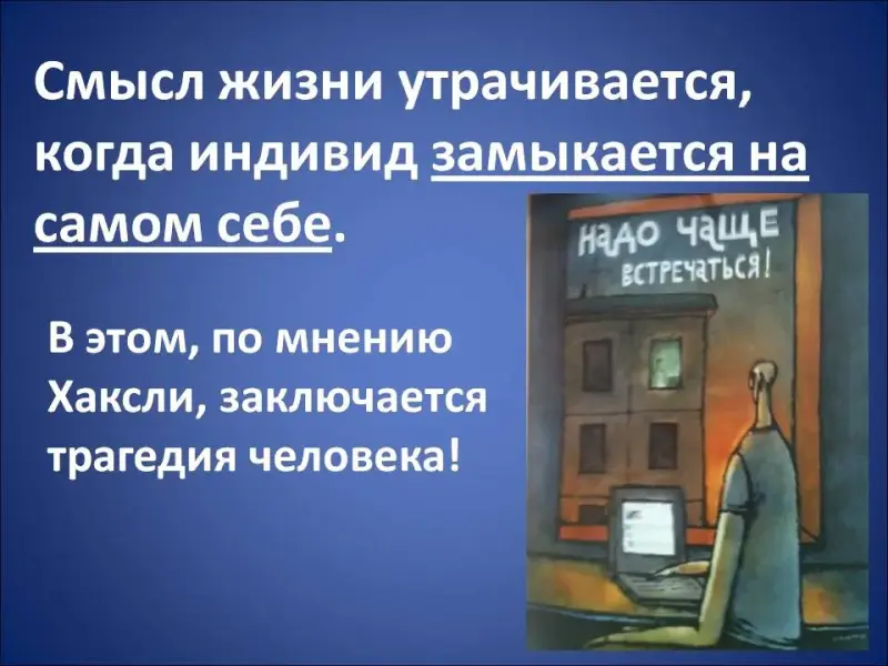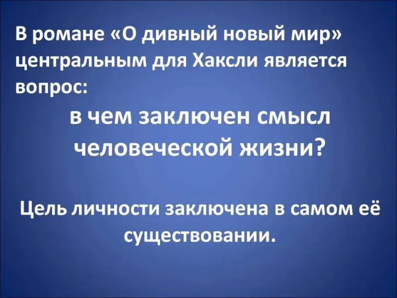 Хаксли занимает принципиально другую позицию. В романе «О дивный новый мир» центральным для автора является вопрос: в чем заключен смысл человеческой жизни. Цель личности находится в самом её существовании. Смысл жизни утрачивается, когда индивид замыкается на самом себе (Слайд 22-23). Именно в этом автор видит трагедию человечества в «дивном мире». Гельмгольц, успешный и популярный человек в дивном мире, постоянно мучается жаждой творчества: (Слайд 24)