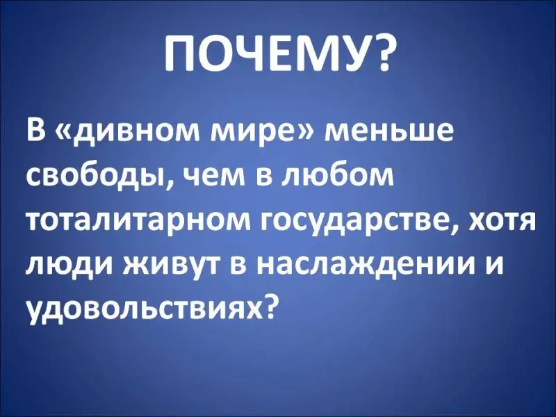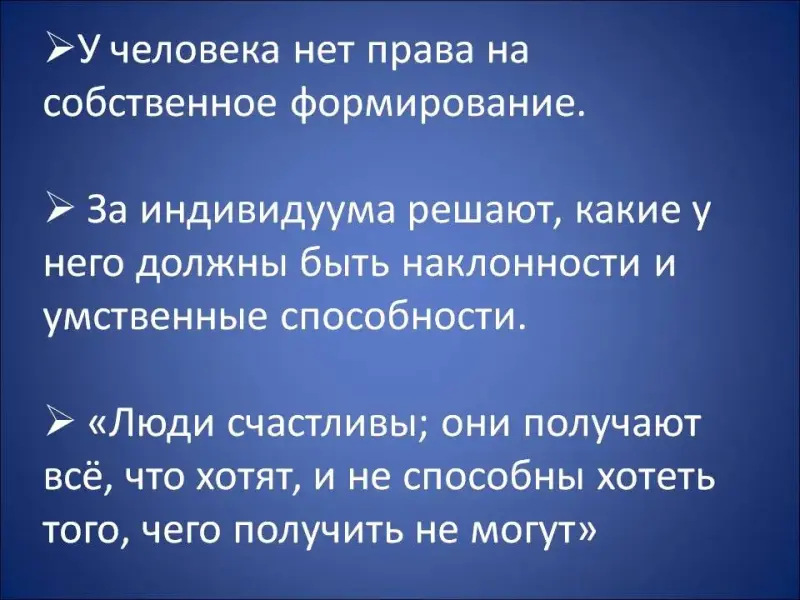 Действительно, на первый взгляд может показаться, что в дивном мире царит полная свобода, нужно только наслаждаться жизнью и существовать в свое удовольствие. Но при внимательном рассмотрении оказывается, что в таком обществе больше ущемлены права человека, чем в любом самом тоталитарном режиме (Слайд 25). У человека нет права на собственное развитие. Еще в зародышевом состоянии за индивидуума решают, какие у него должны быть наклонности и умственные способности. «Люди счастливы; они получают всё, что хотят, и не способны хотеть того, чего получить не могут»[10] (Слайд 26).