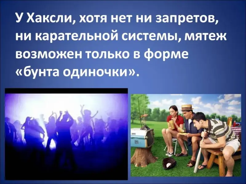 Запрет побуждает к сопротивлению, поэтому и у Замятина, и у Оруэлла мятеж возможен, хотя и терпит поражение. У Хаксли, хотя нет ни запретов, ни карательной системы, мятеж возможен только в форме «бунта одиночки», но немногие «одиночки» способны на этот бунт (Слайд 27-28). Сами люди не хотят менять свой образ жизни, к которому привыкли и изначально предназначены (Слайд 29).