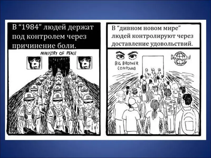 В основе оруэлловского мира лежит ненависть и запрет, а основе «дивного нового мира» у Хаксли лежит согласие и довольство.