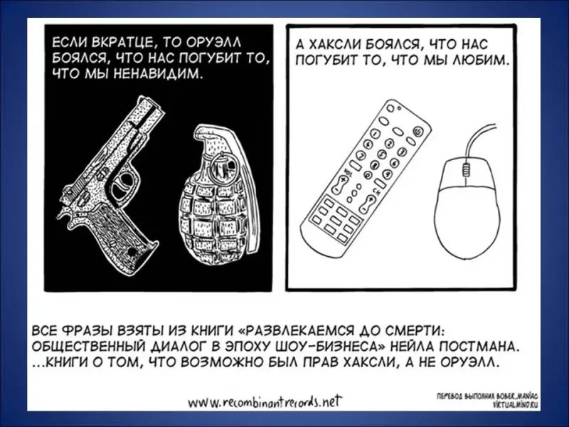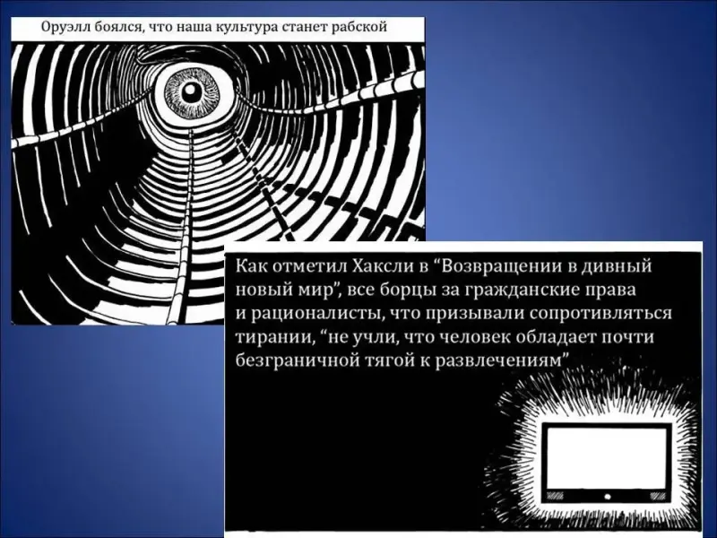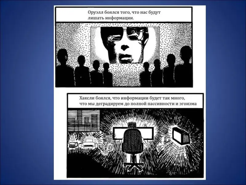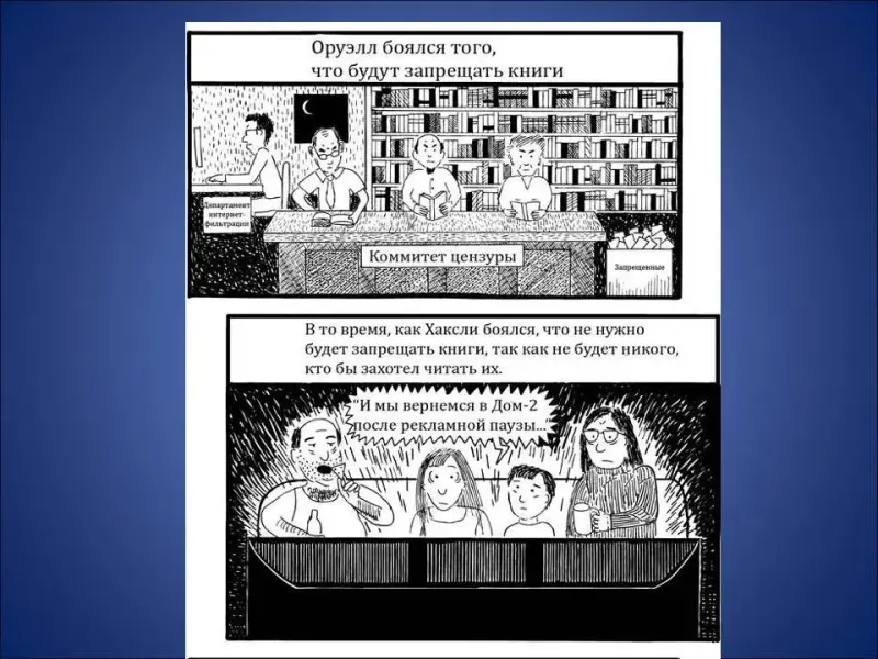 Чтобы ответить на этот вопрос, я предлагаю обратить внимание на несколько карикатурных работ под названием: «Оруэлл против Хаксли» (Слайд 32):
