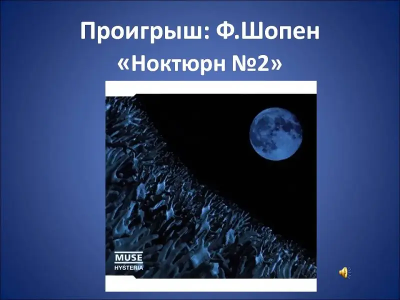 Вопрос учителя: Определите основную мысль этого музыкального произведения. Обратите внимания, что в конце музыканты исполняют в качестве проигрыша отрывок Ф. Шопена «Ноктюрн №2» на фоне звуков природы. Как вы думаете, с какой целью это сделано? Прослушаем эту композицию. Перевод текста на русский язык в раздаточном материале №5