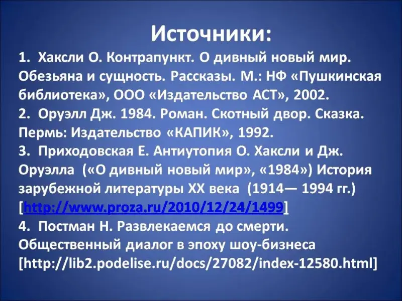 5. Приходовская Е. Антиутопия О. Хаксли и Дж. Оруэлла («О дивный новый мир», «1984») История зарубежной литературы ХХ века (1914- 1994 гг.) // www.proza.ru/2010/12/24/1499