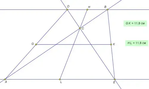 - * Дополнительное задание. Если уж речь заходит о средних линиях, желательно обратить внимание на то, что вторая средняя линия трапеции проходит через точку пересечения диагоналей трапеции, а её продолжение через точку пересечения продолжений боковых сторон.
