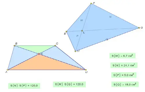 Как нашу гипотезу превратить в теорему? Для частного случая, когда в качестве выпуклого четырехугольника выбирается трапеция, дополнительно можно при помощи построений убедиться в том, что площади треугольников, примыкающих к боковым сторонам равны, а площади подобных треугольников, примыкающих к основаниям, относятся, как квадраты длин оснований.