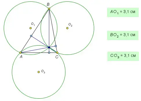 - Проведете окружность через три вершины треугольника, измерьте радиус описанной окружности.