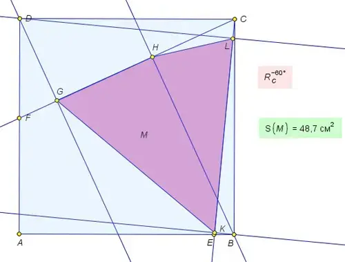 Построения и вычисления в программе "Математический конструктор" показывают, что величина площади многоугольника является инвариантом, причем в случае вырождение четырехугольника в треугольник результат не изменяется. Объяснение происходящему можно найти, если увидеть, что отрезок DC виден из точек G и L под прямым углом, то есть последние две точки лежат на окружности с диаметром DC. Аналогично, точки H и К лежат на окружности с диаметром BC. Диагонали многоугольника искомой площади GL и KH видны из соответствующих точек окружностей под углом 60° и из равенства вписанных углов можно доказать, что они перпендикулярны друг другу. Следовательно, площадь четырехугольника равна половине произведения его диагоналей, от расположения точки Е на стороне квадрата площадь не меняется.