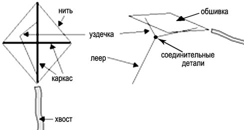 - Обшивка, каркас, соединительные детали, уздечка, хвост, леер, катушка для запуска.