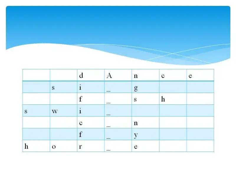 - Today is a special day. We will revise everything that we learned on the topic … . But it's a secret. Firstly, look at the screen, do this puzzle and you'll know the topic of our lesson. (Слайды 2-9) (Учащиеся хором называют пропущенные буквы в словах и таким образом определяют тему урока).