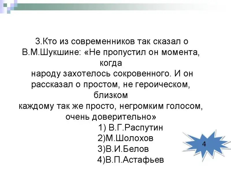 Сейчас мы познакомимся с В.М.Шукшиным поближе, послушав рассказ о его непростой судьбе, попробуйте ответить на следующие вопросы, они перед вами: