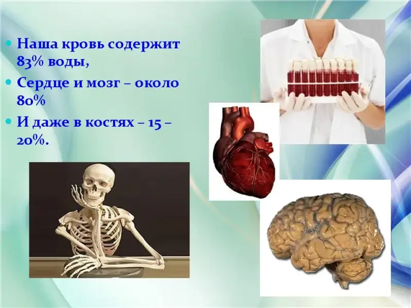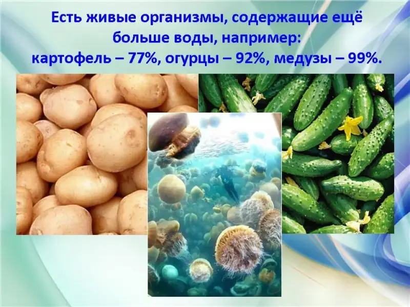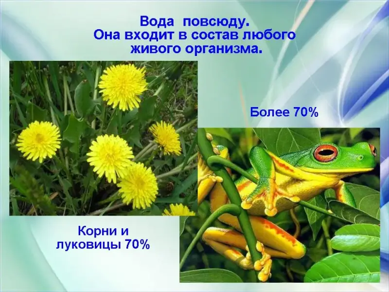 Вода повсюду. Вода входит в состав любого живого организма. Достаточно помять лист растения в руках и мы обнаружим влагу. В теле животных вода обычно составляет больше половины массы. Много воды и в теле человека. Воду пьют поля и леса. Без нее не могут жить ни звери, ни птицы, ни люди.