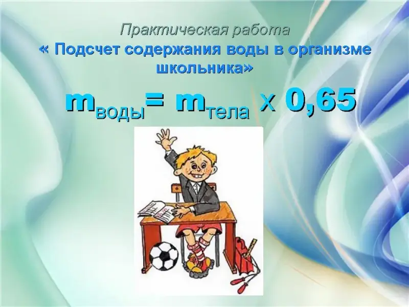 Слайд 22. Практикум «Подсчет содержания воды в организме школьника» mводы= mтела х 0,65