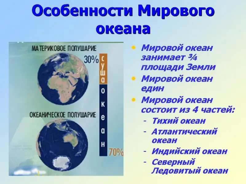 Площадь всех океанов и морей составляет 71 % поверхности Земли. На долю суши приходится 29%.