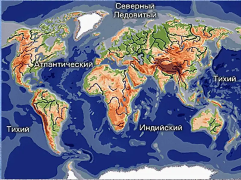 Покажите их на карте в порядке убывания их площади. (Тихий, Атлантический, Индийский, Северный Ледовитый)
