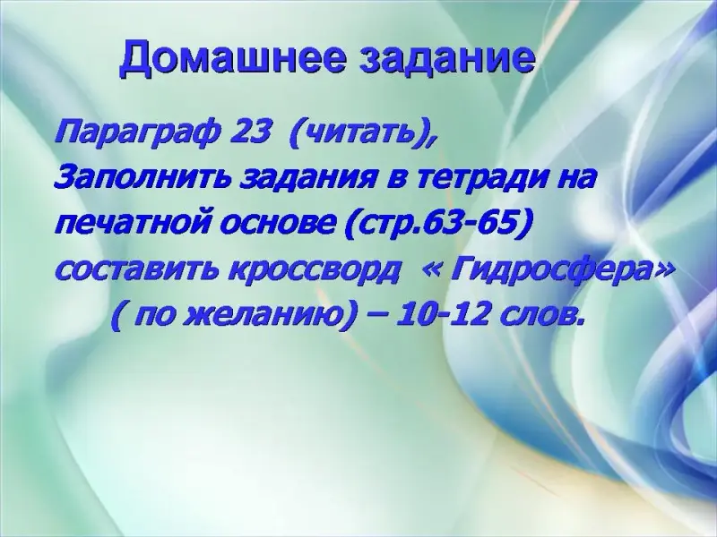 - Научиться по памяти давать определение понятий гидросфера и мировой круговорот воды.