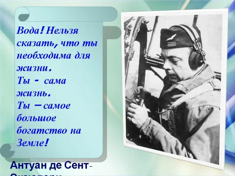 «Вода! Нельзя сказать, что ты необходима для жизни. Ты - сама жизнь. Ты наполняешь нас невыразимой радостью… Ты - самое большое богатство на свете»»