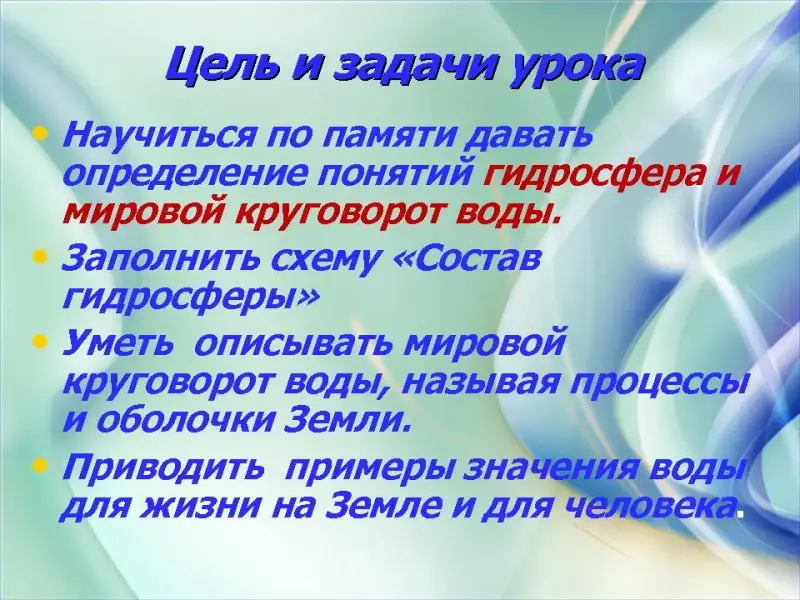 Образовательные: способствовать формированию знаний о гидросфере, как оболочке Земли, её составных частях, Мировом круговороте Воды в природе.