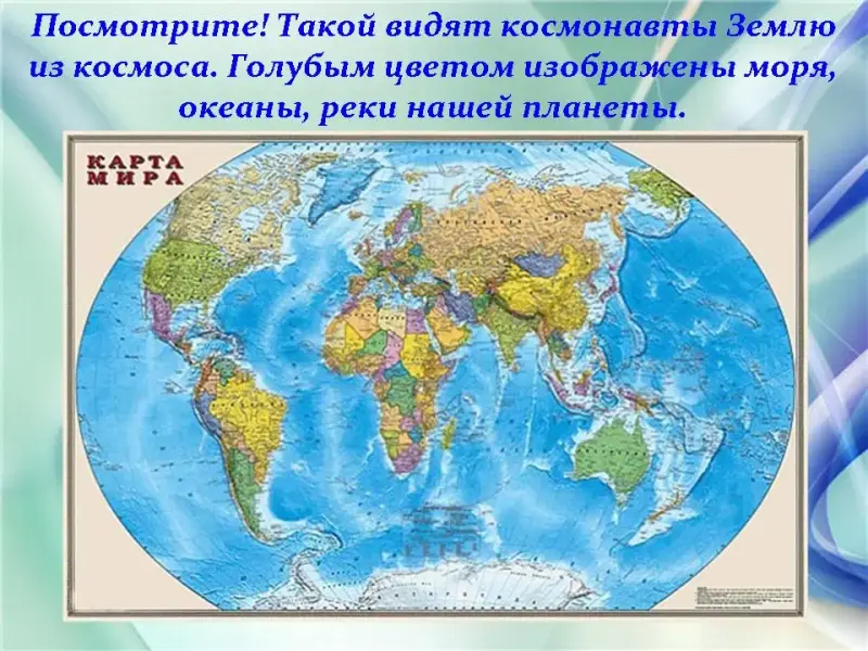 Посмотрите! Такой видят космонавты Землю из космоса. Из космоса наша земля кажется голубой. Этой краски больше всего и на глобусе, и на карте. Это так, потому что значительную часть поверхности планеты занимают водные пространства. Голубым цветом изображены моря, океаны, реки нашей планеты.