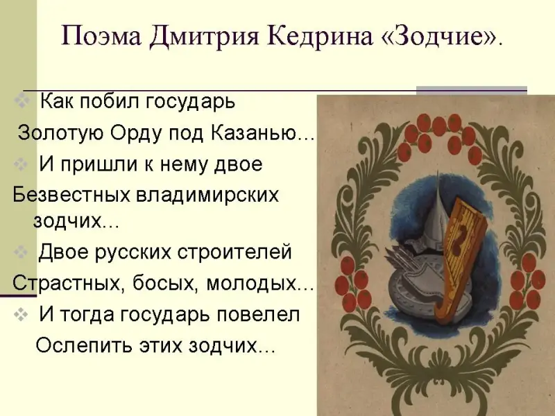 Слайд Василий Блаженный Более известно другое название Покровского собора - храм Василия Блаженного. По имени юродивого, похороненного на этом месте. Эта легенда послужила темой прекрасной поэмы Дмитрия Кедрина «Зодчие», прослушайте внимательно отрывок из неё и попробуйте доказать, что это не быль, а легенда. (Приложение 1)