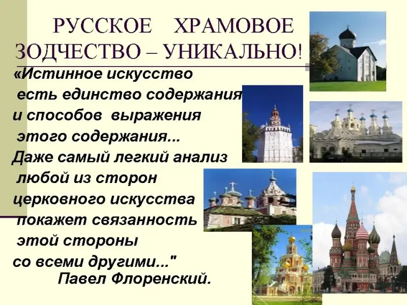 Слайд Вывод Русское храмовое зодчество не просто самобытно, оно -уникально. Ведь на протяжении веков русские люди не просто строили храмы, они - творили, искали новые формы, узнав об одном типе храмов -крестово-купольном- создали свои, новые. Это и храмы-корабли, и церкви- ротонды, и в духе национальной традиции великолепные шатровые храмы. Русские мастера использовали всё своё умение и в украшении храмов: ряды кокошников. каменная кайма, поразительное единство с природой делали каждый храм уникальным .