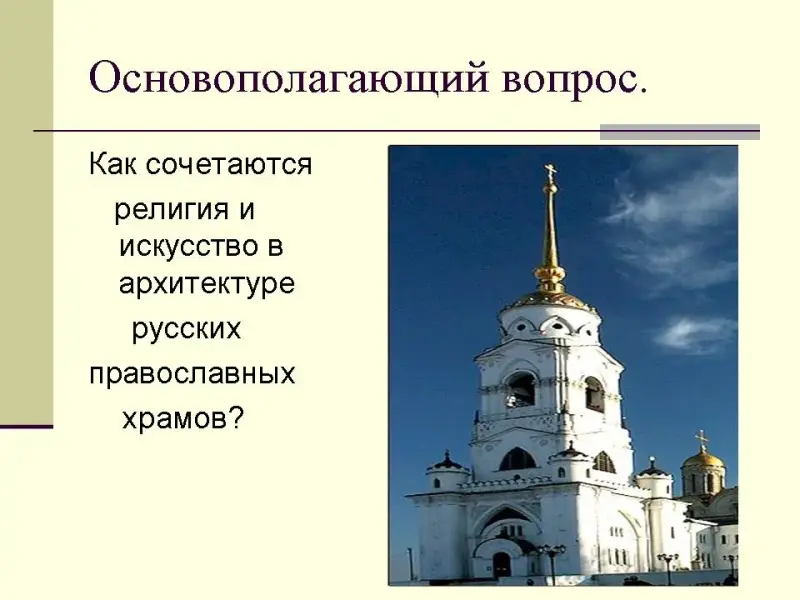 Основным вопросом нашего сегодняшнего исследования будет вопрос, который мы сформулируем так: Как сочетается религия и искусство в архитектуре русских православных храмов?