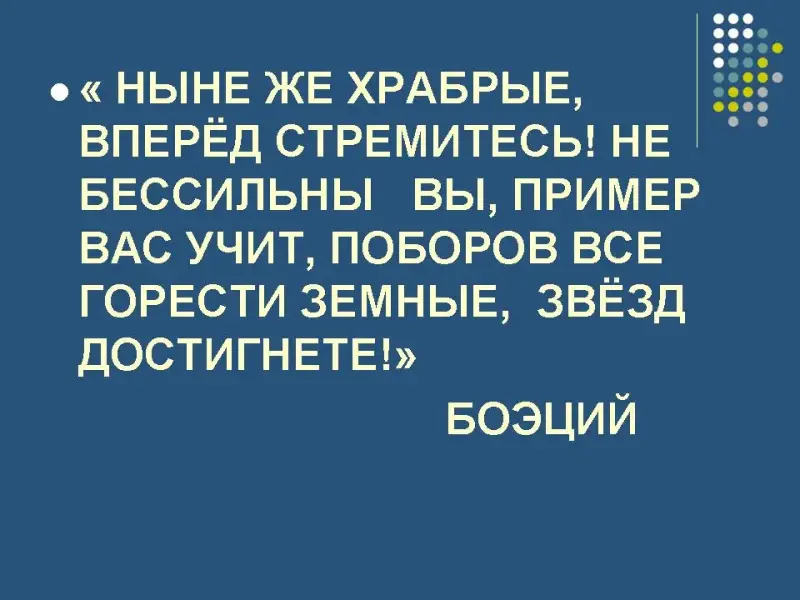 Учитель русского языка: В качестве напутствия нашему путешествию будут слова средневекового философа Боэция. «НЫНЕ ЖЕ ХРАБРЫЕ, ВПЕРЁД СТРЕМИТЕСЬ! НЕ БЕССИЛЬНЫ ВЫ, ПРИМЕР ВАС УЧИТ, ПОБОРОВ ВСЕ ГОРЕСТИ ЗЕМНЫЕ, ЗВЁЗД ДОСТИГНЕТЕ!» БОЭЦИЙ