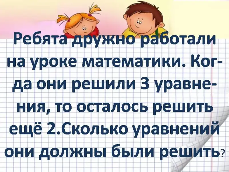 8. Включение в систему знаний и повторение. - На уроке много считали. Предлагаю решить задачу. На экране: РЕБЯТА ДРУЖНО РАБОТАЛИ НА УРОКЕ МАТЕМАТИКИ. КОГДА ОНИ РЕШИЛИ 3 УРАВНЕНИЯ, ТО ОСТАЛОСЬ РЕШИТЬ ЕЩЁ 2. СКОЛЬКО УРАВНЕ-НИЙ ОНИ ДОЛЖНЫ БЫЛИ РЕШИТЬ? - Возьмите белые листочки, заполните схемы, запишите решение задачи.