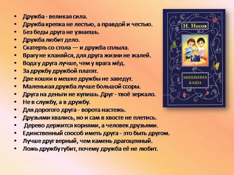 Коля и Миша разные по характеру, но они похожи тем, что умеют дружить. У вас на столах находятся горшочки, но в них спряталась не каша. Загляните в горшочки. Да, там пословицы. Объясните значение пословиц. Какой смысл заложил в них народ или какую мудрость хотел донести до нас народ.