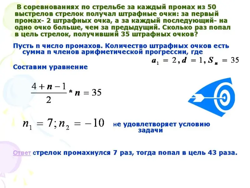 Итак, мы увидели применение арифметической прогрессии при решении задачи физического содержания.