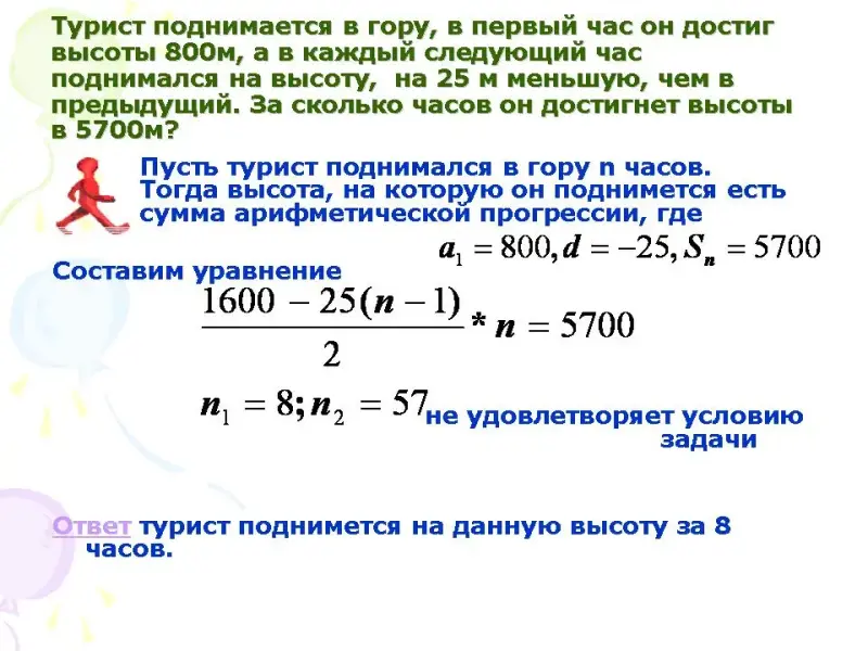 * Турист поднимается в гору, в первый час он достиг высоты 800 м, а в каждый следующий час поднимался на высоту, на 25 м меньшую, чем в предыдущий. За сколько часов он достигнет высоты в 5700м?