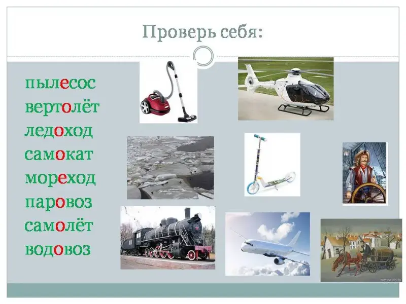 ПЫЛЕХОД, ВЕРТОСОС, ЛЕДОКАТ, САМОВОЗ, МОРЕЛЁТ, ПАРОЛЁТ, ВОДОХОД, САМОВОЗ