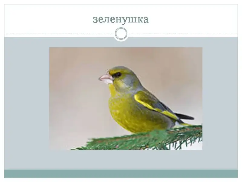 - Эта птичка вся зеленая с серым оттенком на спине и желтым по бокам. У нее очень красивый голос, поэтому ее еще называют лесной канарейкой. (Зеленушка)