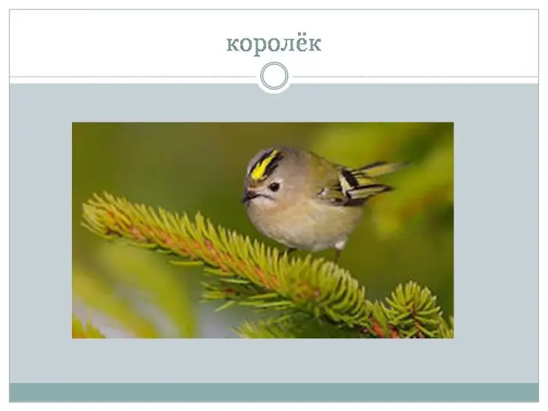 - На головке этой птички - корона. Короны, как известно, бывают у королей. Но птичка очень маленькая. Ростом меньше стрекозы, поэтому и назвали ее .... (Королек)