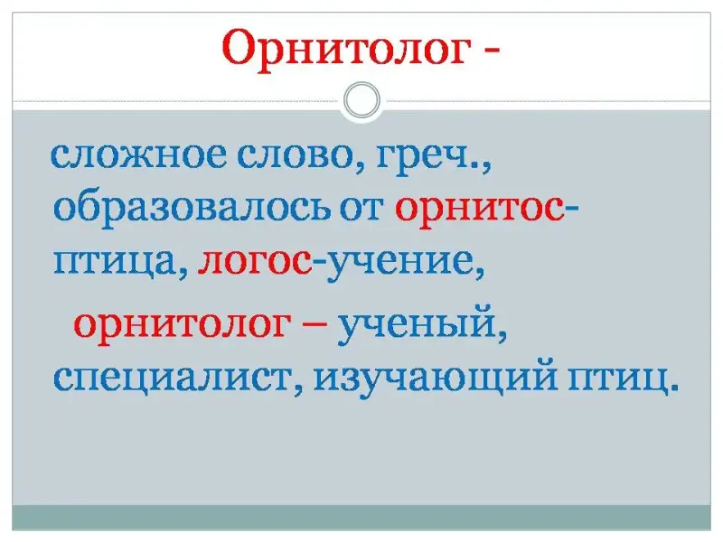 (Сложное слово, греч., образовалось от орнитос - птица, логос - учение, орнитолог - ученый, специалист, изучающий птиц)