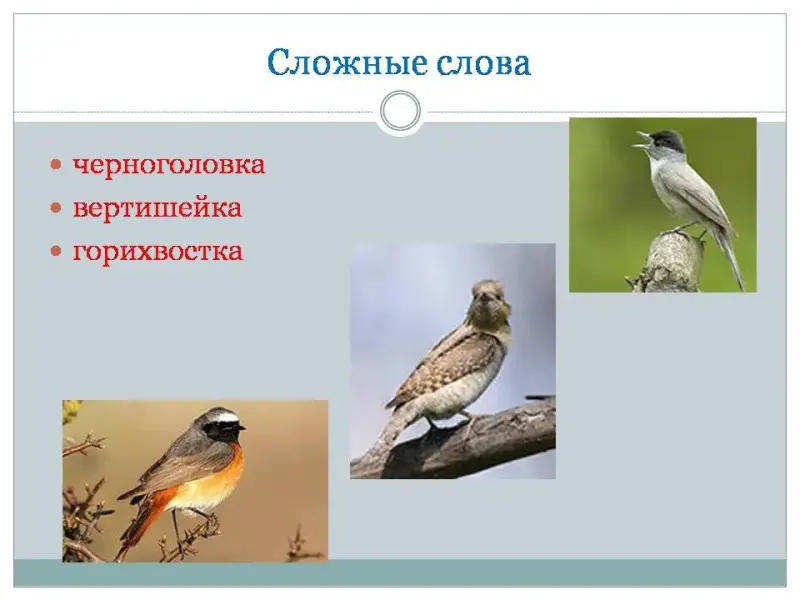 - Найдите в кроссворде слова с двумя основами. (Черноголовка, вертишейка, горихвостка.)