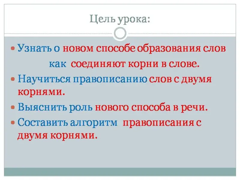 Цель: Способствовать формированию у учащихся представление о понятии «сложные слова», как новый способ образования слов; создание алгоритма правописания соединительной гласной в сложных словах.