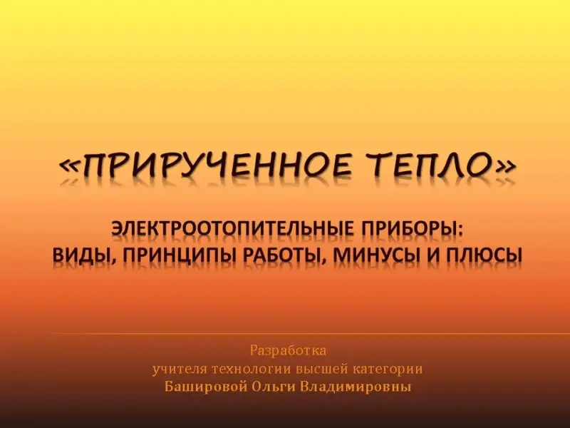 Учитель: Правильно, ребята. Тепло - это основа всего живого. Без тепла человек не может комфортно жить. Поэтому в регионах с холодным и умеренным климатом обязательно предусматривают отопление жилых помещений. Отопление - это искусственное обогревание помещений. В наших домах существует центральное отопление, монтаж которого проводится в процессе возведения здания, но иногда его оказывается недостаточно и многие из нас прибегают к использованию дополнительных электроотопительных приборов. Вот именно про такое «прирученное тепло» мы с вами и будем говорить (слайд 2).